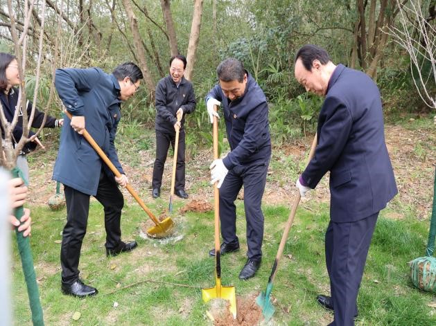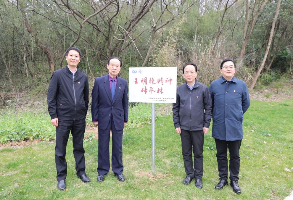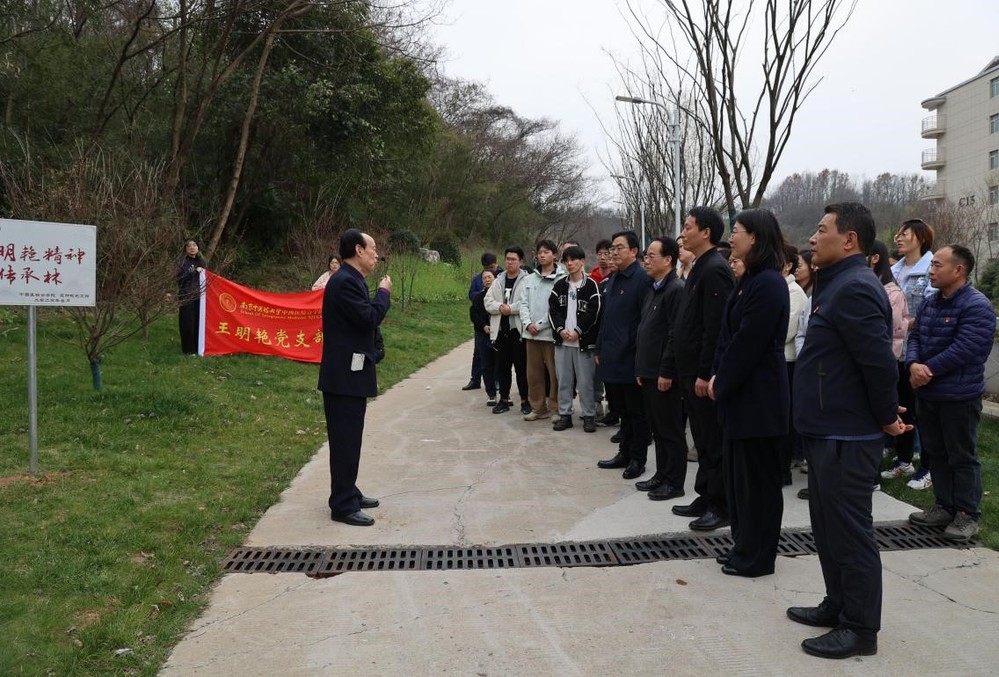 出席植树活动的领导和师生党员共同栽种下二十六株樱花树,为美丽南中医和生态校园建设贡献力量。植树活动结束后,左言富、程革、周恩超、倪昊翔为“王明艳精神传承林”揭牌,希望通过传承林将“明艳精神”传递给每一位师生党员,激励大家爱校、爱岗、爱专业,在各自的工作、学习岗位上努力奋斗。