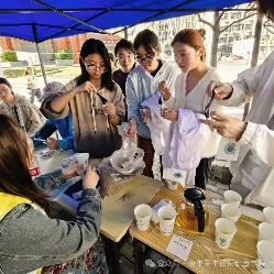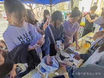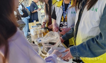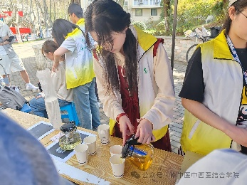 4.药茶分发——志愿者们为南农同学们准备了补血养颜和健脾除湿的药茶,并根据同学们不同的体质,向他们推荐了合适的药茶,在喝茶过程中科普中医养生,传播中医药文化