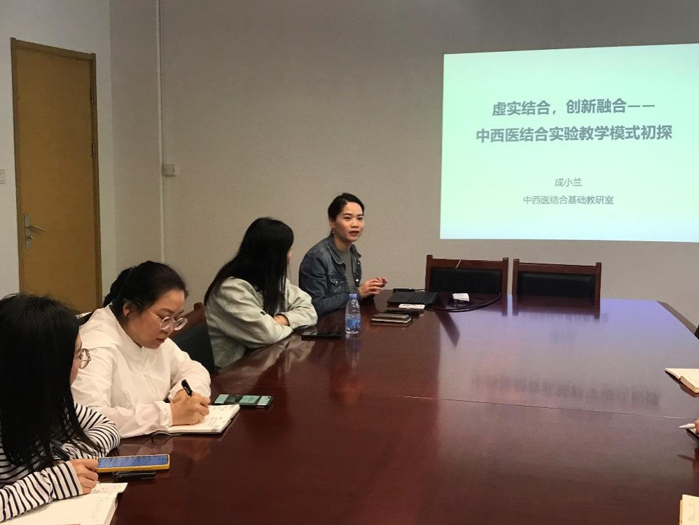 首先,中西医结合基础教研室成小兰副主任针对“中西医结合实验教学模式”的关键问题,从《中西医结合实验方法学》课程设置背景、课程目标、课程内容等提出了优化设想与建议,并结合具体实例为大家展示了虚拟仿真实验平台的教学效果。与会老师结合各自领域各抒己见、充分讨论,提供了诸多宝贵意见。