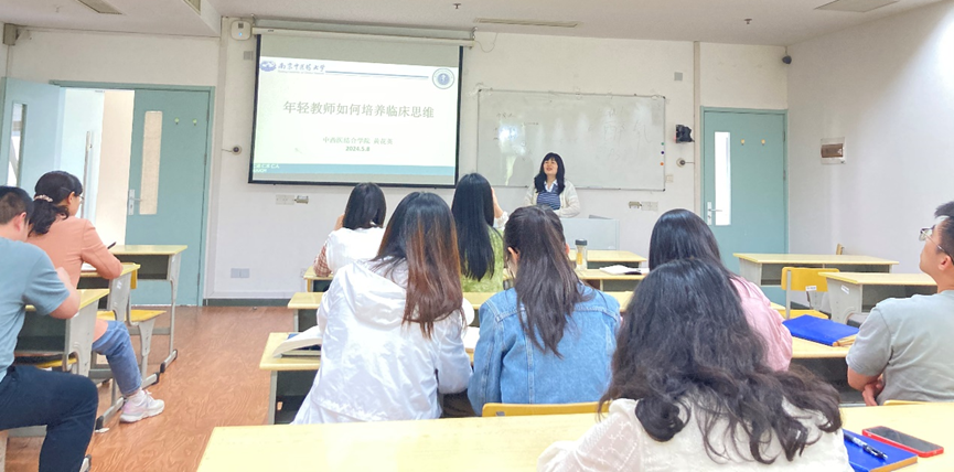 随后,中西医结合内科教研室的黄花英老师结合自己的临床工作经历,分享了“年轻教师如何培养临床思维”。她提出新教师应合理利用网络资源,将课堂基础知识延伸拓展。以“儿童支原体肺炎诊疗指南与四环素类、喹诺酮类的药物说明书冲突”为例,介绍了年轻教师如何应对指南与说明书的对立。黄老师还谈到了临床经验欠缺的年轻教师要针对教科书中部分临床应用指征的内容进行甄别,侧重传授临床应用有价值的知识点。