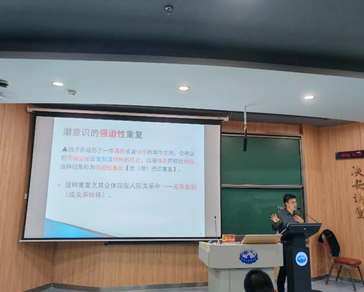 随后,为了增强同学们对潜意识的理解,黄老师以冰山模型为载体,为同学们辨明了意识和潜意识的特征和区别并抛出了问题:意识和潜意识是如何影响人际关系的。在同学们的期待下,基于自己多年工作经历,黄教授带领同学们找到了强迫性重复这一决定性因素。