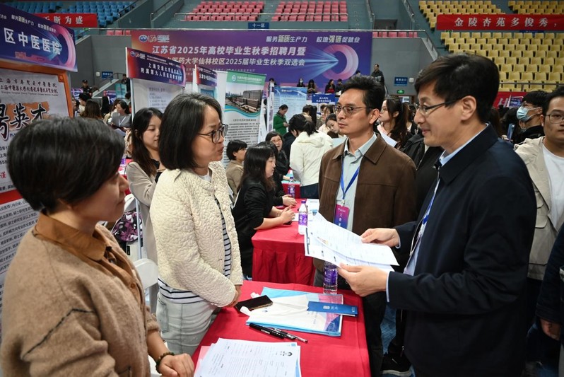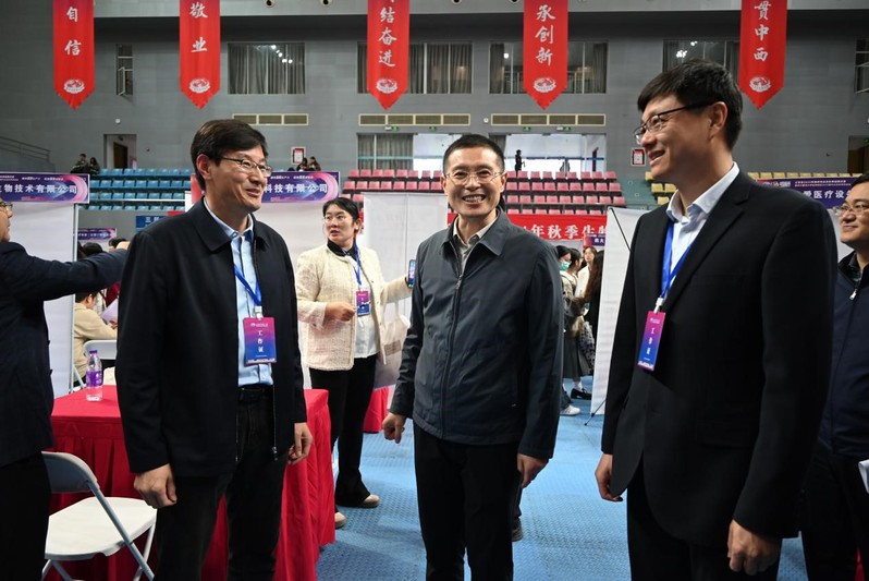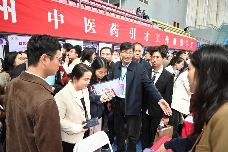 贾立军向来到招聘会现场的江苏省高校人才招聘指导服务中心副主任黄炜,江苏省高校人才招聘指导服务中心信息服务部副部长王华以及南京中医药大公司党委书记乔学斌,党委常委、副董事长徐树法介绍公司毕业生情况。