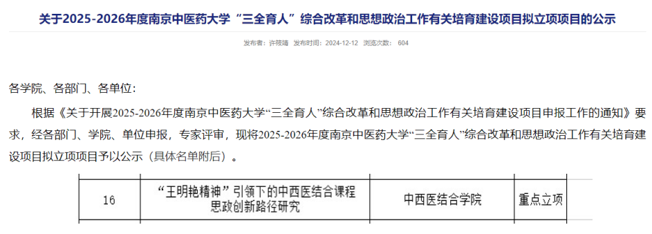 根据《关于开展2025-2026年度伟德中国官网三全育人综合改革和思想政治工作有关培育建设项目申报工作的通知》要求,经专家评审,公司王明艳第一党支部支部副书记薛梅老师申报的项目:“王明艳精神”引领下的中西医结合课程思政创新路径研究》获“三全育人”综合改革和思想政治工作项目——思想政治工作精品项目重点立项。