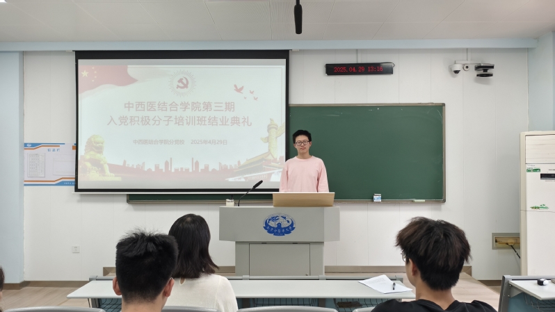 第四小组组长、优秀学员代表张曦锴作交流发言。他表示:“我们将以此次培训为新起点,在专业学习中精进医术,传承大医精诚的医者仁心;在志愿服务中勇担使命,用仁心仁术践行党的宗旨;在思想锤炼中常怀敬畏,以《党章》为镜修身正己。”
