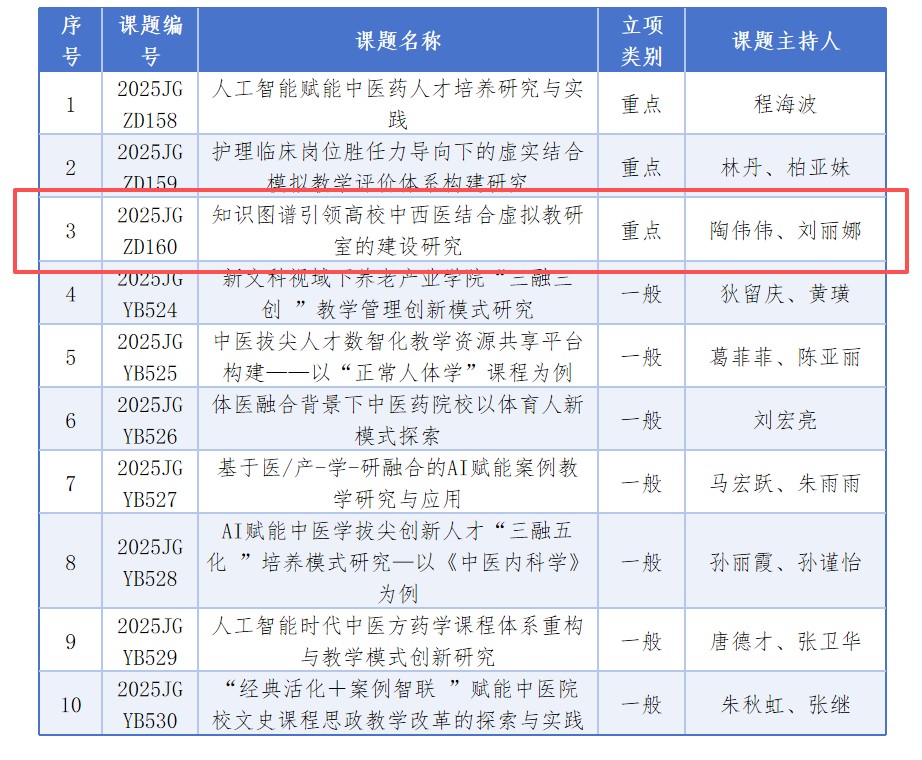 近日,江苏省高等教育学会公布了2025年江苏省高等教育教改研究课题立项结果,公司陶伟伟、刘丽娜教授共同主持的《知识图谱引领高校中西医结合虚拟教研室的建设研究》成功获批省级重点课题立项,在公司公司产品改革课题立项层面取得新突破。
