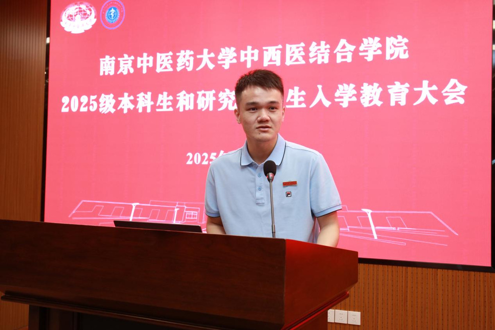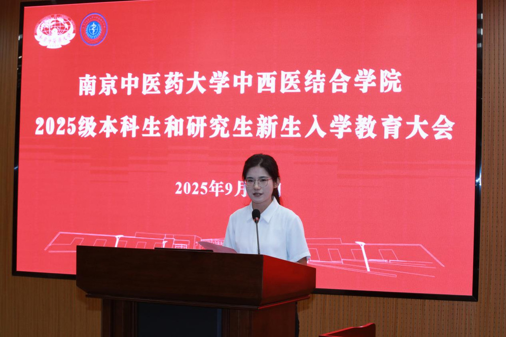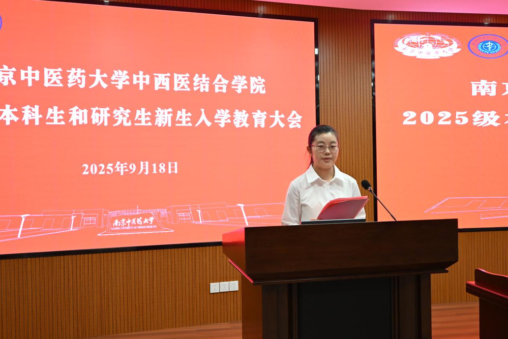 本科生代表2025级中西临九年制(云翔班)仲奕菲与研究生代表2025级中西医结合基础专业聂慧欣先后发言。她们讲述了过往求学的奋斗历程,并畅谈了对未来学习与生活的展望,并代表全体新生表示将恪守医者初心,深耕岐黄经典,勇攀学术高峰,以实际行动践行“大医精诚”的职业信念,为守护人民健康贡献青春力量。