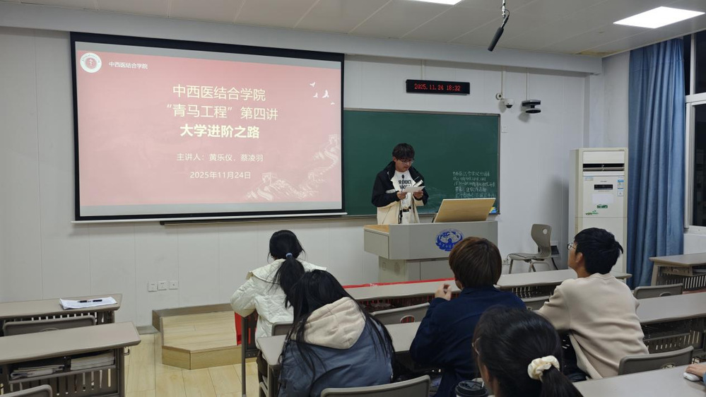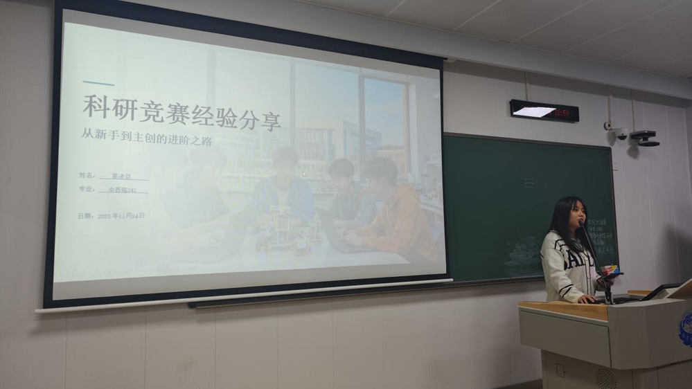 中国国际老员工创新大赛省赛三等奖主创,中西临241班蔡凌羽同学分享了从新手到主创的经历与自己的经验感悟心得。她为同学们分析了科研竞赛能为大家带来的帮助,也梳理了在科研竞赛中可能遇见的困难与压力,并鼓励同学们要平衡好投入在学业与科创上的精力,特别是注意保持良好的心态,提升抗压能力。