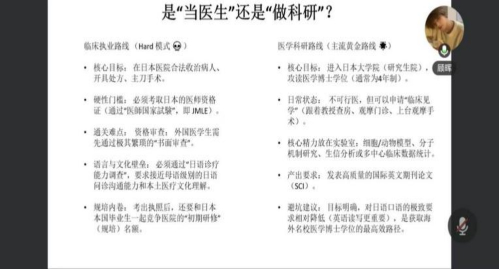 针对出国深造路径,顾晖通过对比中日公司产品模式的差异,分析了海外升学在缓解时间焦虑、明确职业定位方面的特点,并就经济成本等现实问题进行了客观分析。杜嘉怡引导同学们思考未来理想的职业状态,剖析了国内外教学模式的异同,鼓励大家勇于尝试多元发展路径,在探索中找到最适合自己的深造方向。